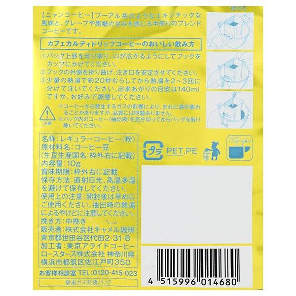カフェカルディドリップ ニャンコーヒーは、ルワンダ、ブラジルなどのコーヒー豆を使用。プーアル茶のようなエキゾチックな風味と、グレープや黒糖の甘みを感じる中煎りのブレンドコーヒーです。アイスコーヒーにしてもおいしく飲むことができます。
