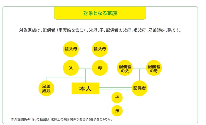 ここでいう「家族」とは、配偶者(事実婚を含む)、父母、子、配偶者の父母、祖父母、兄弟姉妹、孫と定められています。