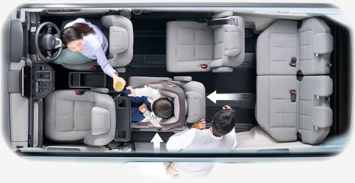 ミニバンのインテリアで注目したいシートアレンジでしょう。新型ステップワゴンには、2列目に前後・左右のスライド機構を採用しています。
