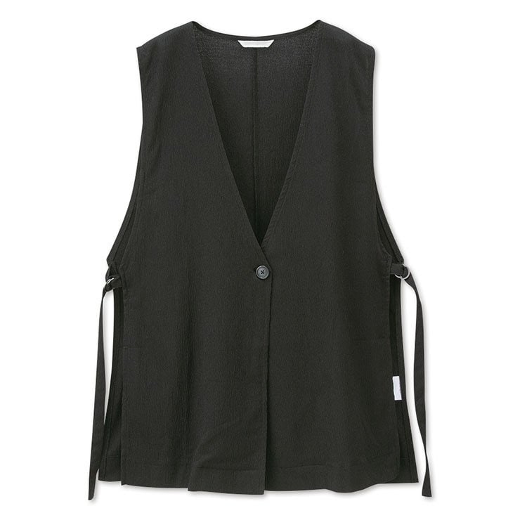 画像のように、ジレにはサイドにベルトがついています。サイドのベルトがコーデに抜け感を出してくれるだけでなく、ウエストの細さを際立たせてもくれるのも嬉しいポイントです。