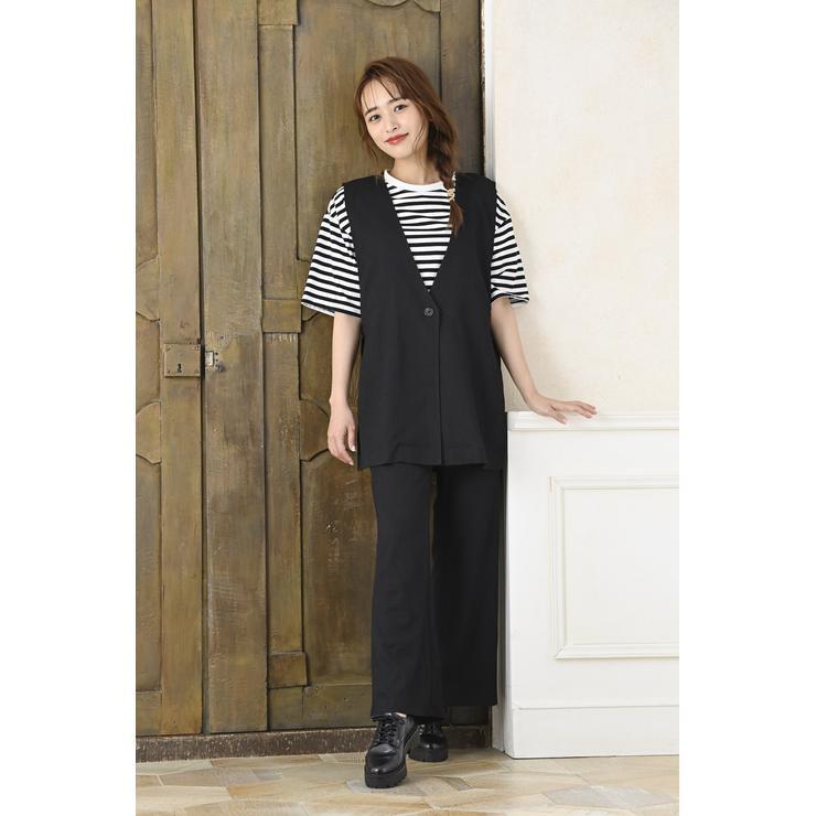 一見するとスカートのように見えるフレアパンツとジレのセットです。サイズは、MとLがあります。値段は、1790円(税込1969円)です。黒のデザインが、フォーマル感を出していますね。