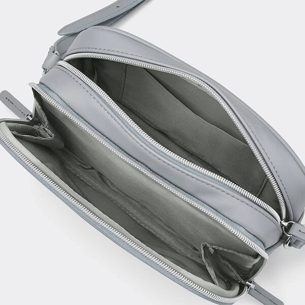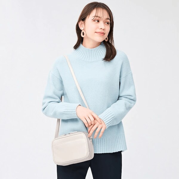 ミニサイズながら、長財布やペットボトルが収納しやすい長方形デザインのショルダーバッグです。画像のオフホワイトの他に、ブラックとブルーがあります。