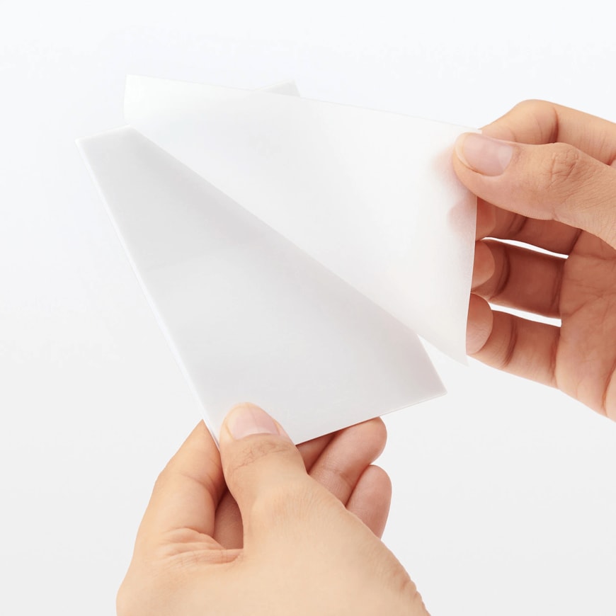 半透明の紙でできた付箋紙です。7cm×9.5cmのサイズで、20枚入りです。価格は、消費税込みで350円です。