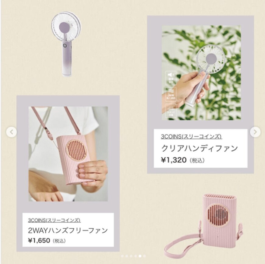 @y_cafe15さんによると、3COINSで揃えたいおしゃれな家電として、クリアハンディファンと2WAYハンズフリーファンが紹介されていました。