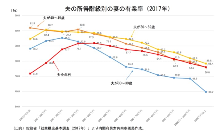 内閣府男女共同参画局「結婚と家族をめぐる基礎データ」をもとに、夫が40代の年収別の妻の有業率をみていきます。
