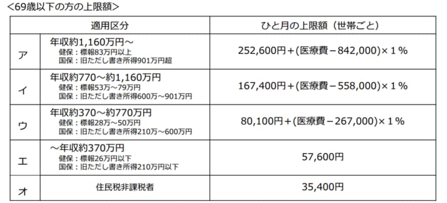 先ほどの例では自己負担額が8万7430円となりましたが、実際には年齢や所得によって上限額が変わります。