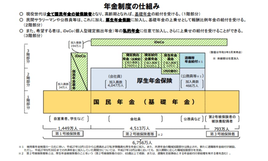 国民年金(基礎年金)は20〜60歳までのすべての国民が対象となる年金です。一方、厚生年金は会社員や公務員が対象となる年金で、1階部分が国民年金(基礎年金)となり、2階部分に厚生年金が上乗せされた形になっています。