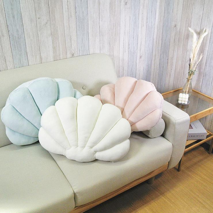 貝殻の形のクッションです。カラーは、グリーン・ホワイト・ピンクがあります。