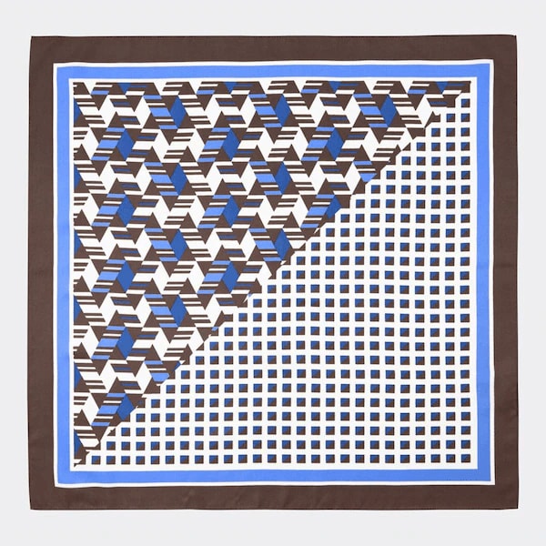 画像のように、対角線上に異なるデザインとなっているスカーフです。カラーは、ダークオレンジ・ダークブラウン・ネイビーの3種類があります。