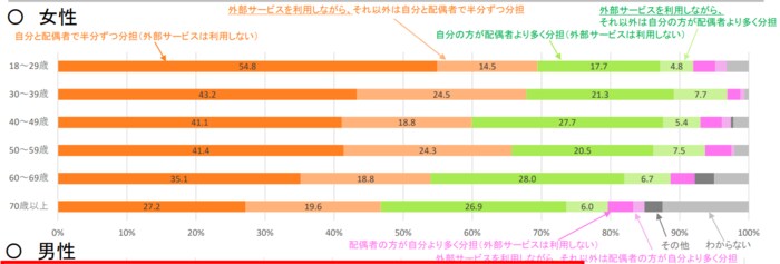 同調査の結果で興味深いのは、家事が女性の役割であるという時代思潮をよく知る60歳以上の女性についても、半数前後が配偶者と家事の二分を希望している点です。専業主婦が現在よりもスタンダードな時代を知る女性たちのなかにも、家事の公平な分担を希望する方が少なくありません。