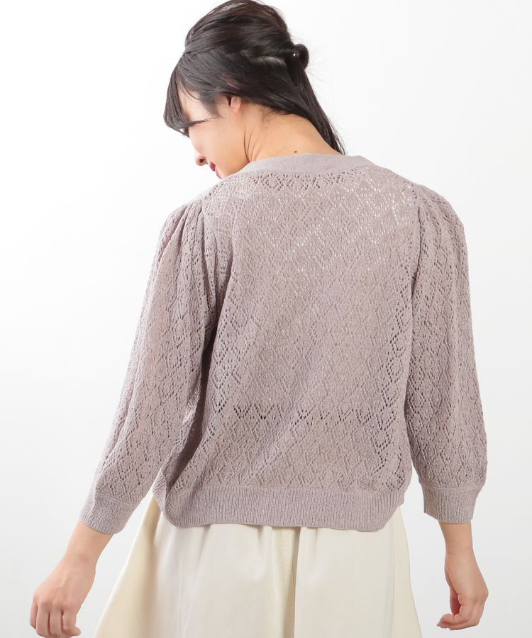 ハニーズの「透かし編カーデ」は、画像のように、袖山部分にたっぷりとギャザーが入っています。羽織ると、自然とふんわりと丸みのあるシルエットになります。