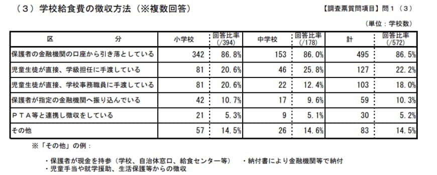 保護者の金融機関の口座から引き落としているところが86.5%あるものの、児童生徒が直接、学級担任に手渡しているところは22.2%にのぼります。