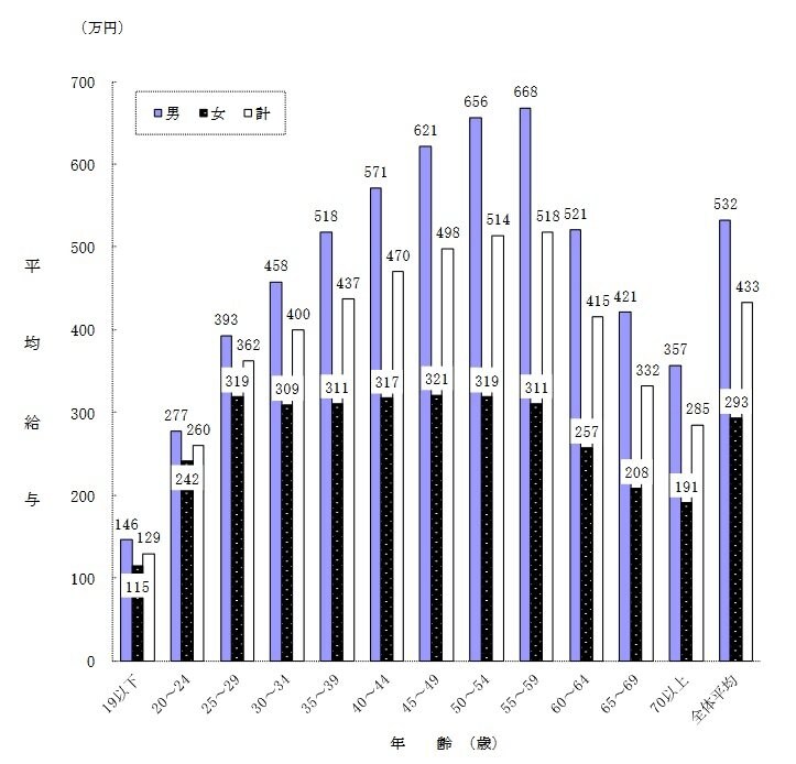 年齢別に見てみると、男性は60歳で退職されるまでは給与が上がりますが、女性の場合は25歳以降がほとんど横ばいです。