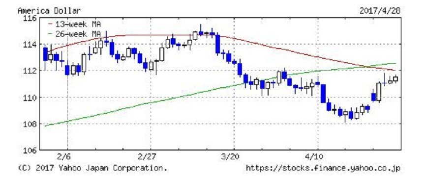 金融市場は、フランス大統領選挙に先立つ週の後半から値動きが少なくなっていましたが、選挙後の先週初めから為替市場はドル/円、ユーロ/ドルともに窓を開けて上昇しました。特にドル/円は111円台後半まで約2円の上昇を見せ、その前の週と合わせると2週間で3.5円以上の上昇となっています。