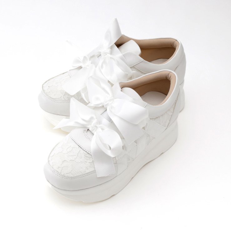 サテンのダブルリボンがチャーミングです。フェミニンな雰囲気のあるスニーカーです。