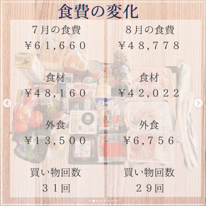 7月は食費として6万1660円かかっていましたが、「食品ロス0」を意識することで、8月の食費を4万8778円まで引き下げることに成功したそうです。