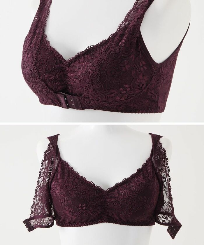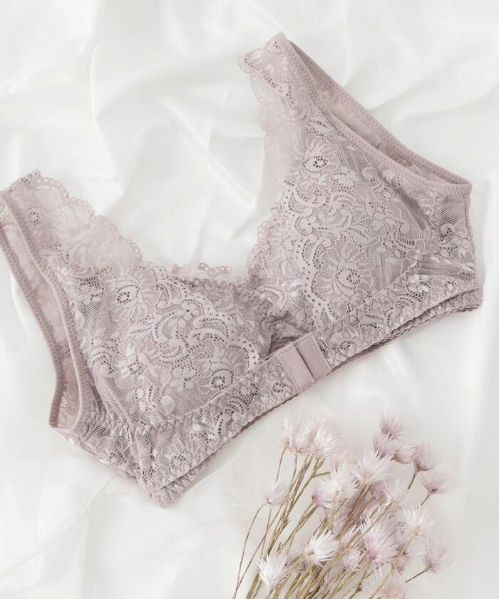 アンダーバスト部分がゴムで、楽な着け心地のナイトブラ。フロントホック採用で、着脱もスムーズです。全体にレースがあしらわれており、シンプルながらもフェミニンな雰囲気のデザインとなっています。