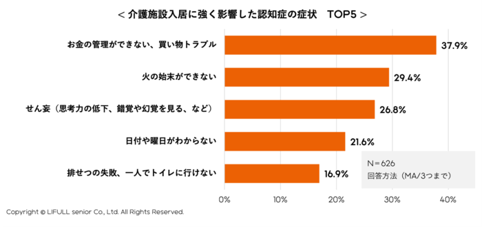 「認知症の症状があった」と答えた人に、介護施設入居に強く影響した認知症の症状を3つ聞いたところ、以下のような結果になりました。