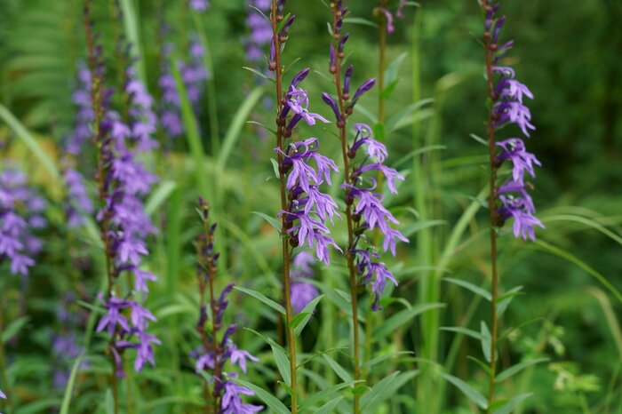 青紫の花が涼しげな印象のサワギキョウ。宿根ロベリアという別名で呼ばれることもあり、高原の湿原などで自生する山野草です。