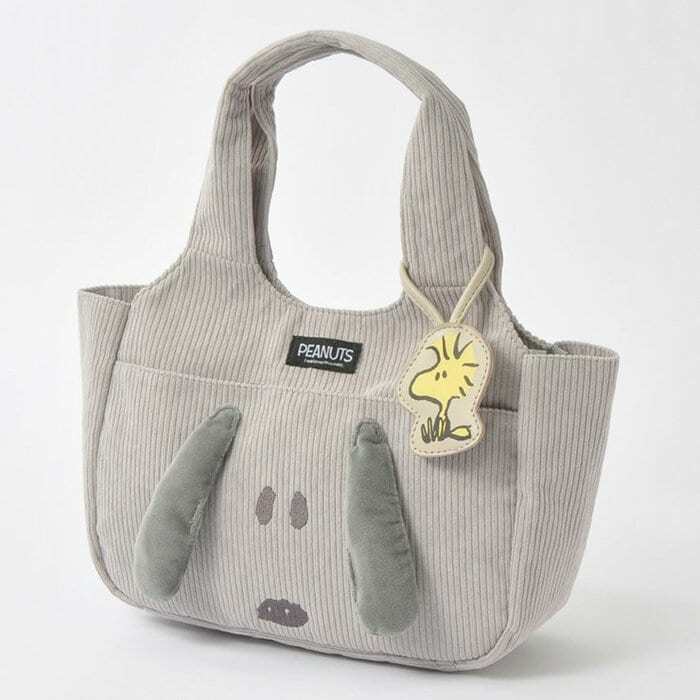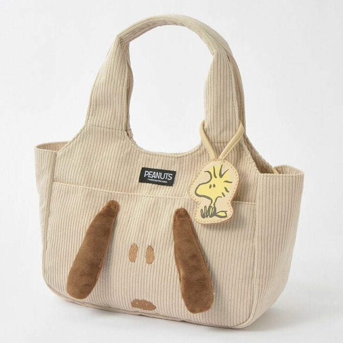 くりて型のフェイストートです。立体耳とウッドストックのチャームがポイントになっています。前面にポケットが付いているのも使いやすい仕様ですね。
