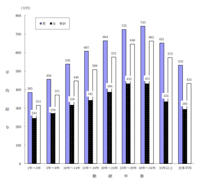 国税庁の資料によると、1年を通じて勤務した給与所得者の1人当たりの平均給与は433万円で、平均年齢は46.8歳(男性46.8歳、女性46.7歳)です。また、平均勤続年数は12.4年(男性13.9年、女性10.1 年)でした。