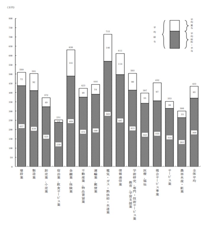 給与がもっとも高いのは「電気・ガス・熱供給・水道業」の715万円、次いで「金融業、保険業」の630万円という結果となりました。