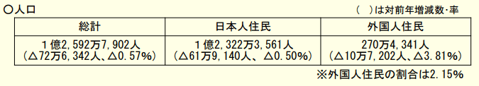 - 外国人:270万4341人(▲10万7202人、▲3.81%)