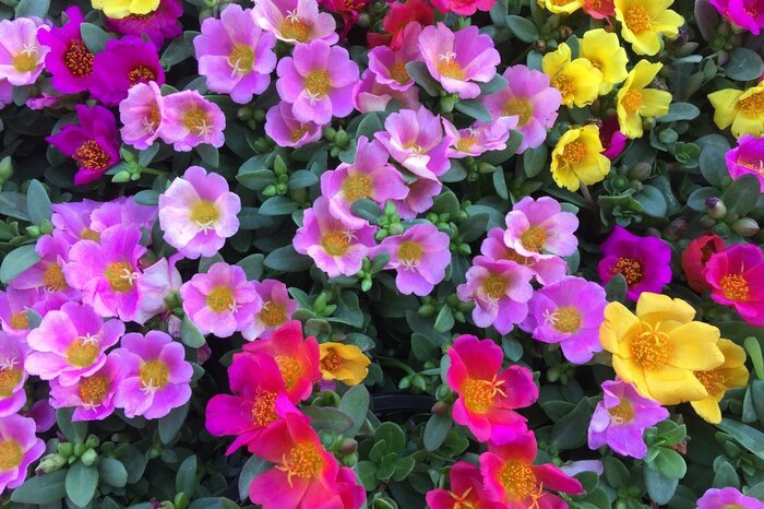 赤や黄、ピンク、オレンジ色など豊富なビビッドカラーが魅力のポーチュラカ。プックリした肉厚の葉を広げます。