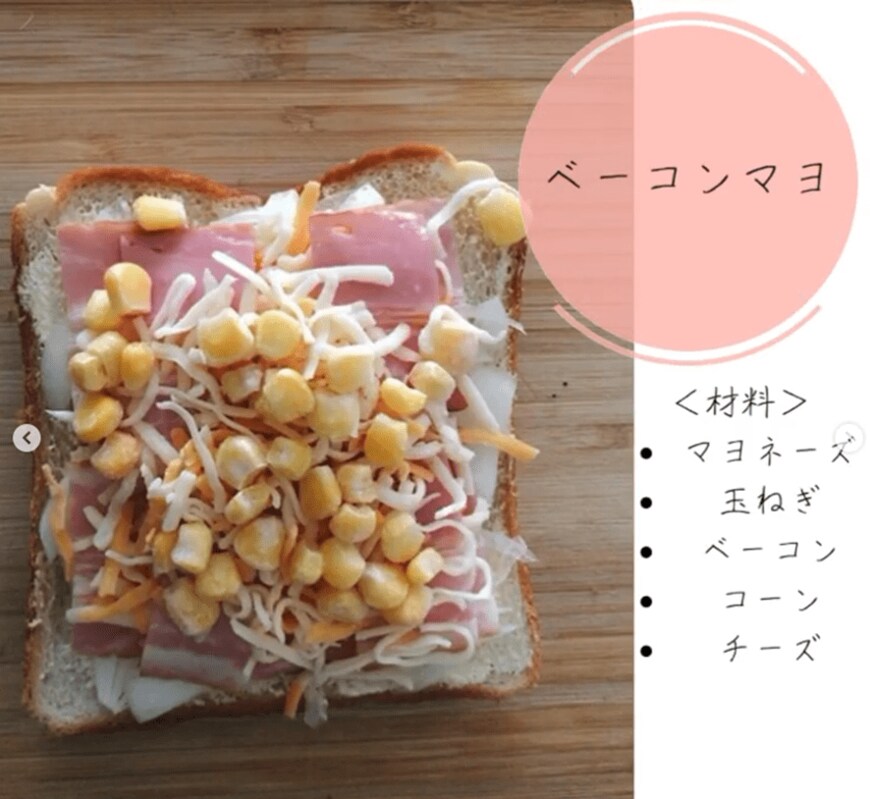 ピーマンの代わりにコーンを乗せると、子どもも大好きなベーコンマヨトーストが完成します。