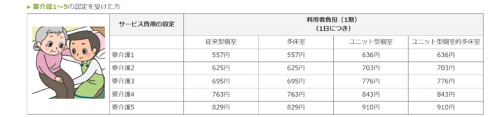 - 食事や入浴、排泄の介助など施設で受けるサービスに対して支払う料金。介護保険が適用されるため、自己負担は1割(所得によって2〜3割)を負担します。