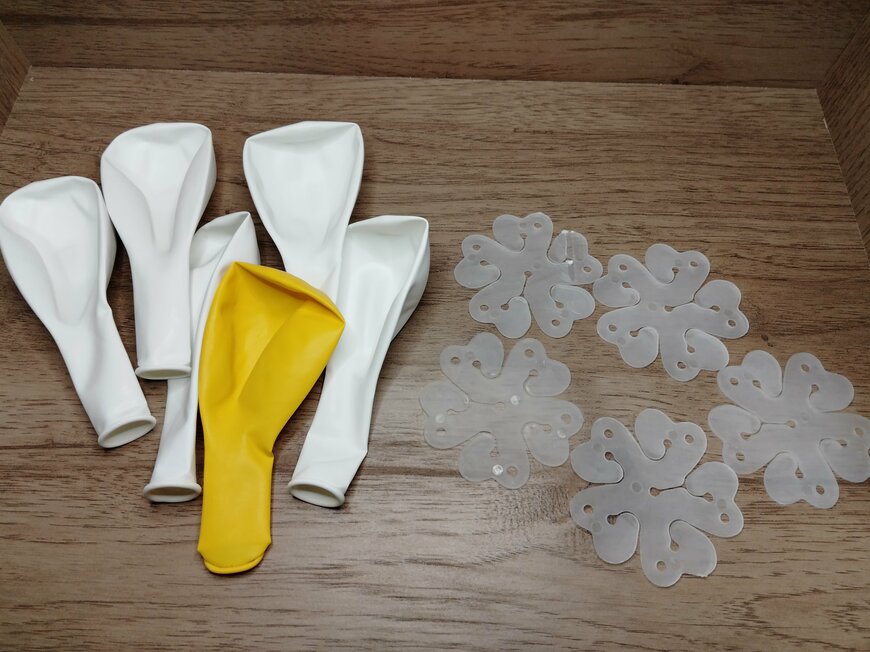 花びらの風船(5つ)と花芯の風船(1つ)を、付属のクリップに通して、フラワーを作ります。