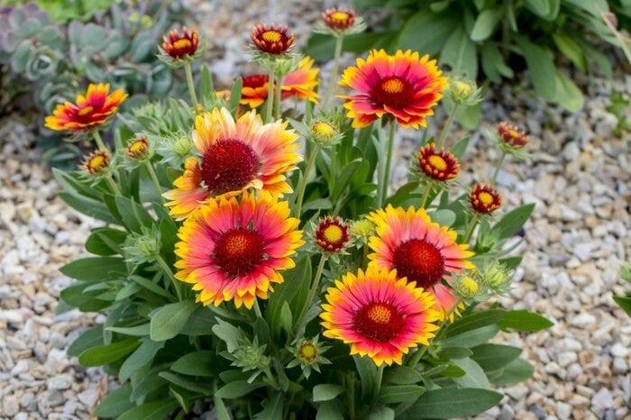 初夏から秋にかけ、ビタミンカラーのオシャレな花で庭を彩るガイラルディア。キク科の植物で、一年草や多年草、一重咲きや八重咲き、ポンポン咲きなど多数の品種があります。