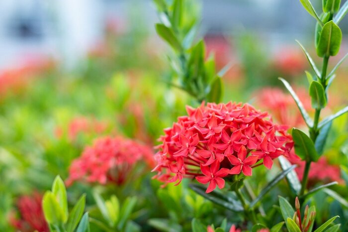 アジサイのような半球状の花姿が美しいサンタンカ。春から秋にかけて開花する多年草ですが、品種によっては草丈1メートルまで育つため低木として扱われることもあります。