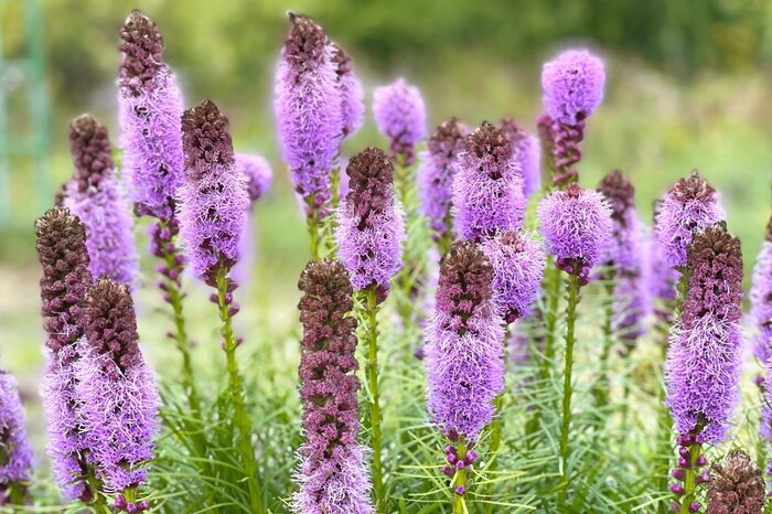 細長い茎に沿うように、フワフワとした形状の花を咲かせるリアトリス。初夏から晩夏にかけて開花する多年草です。