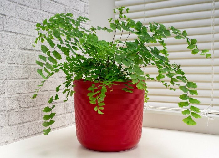 細い茎に小さな薄い葉がふんわりと広がるアジアンタム。日に当たると葉がチリチリになるので半日陰に擱くのがオススメです。