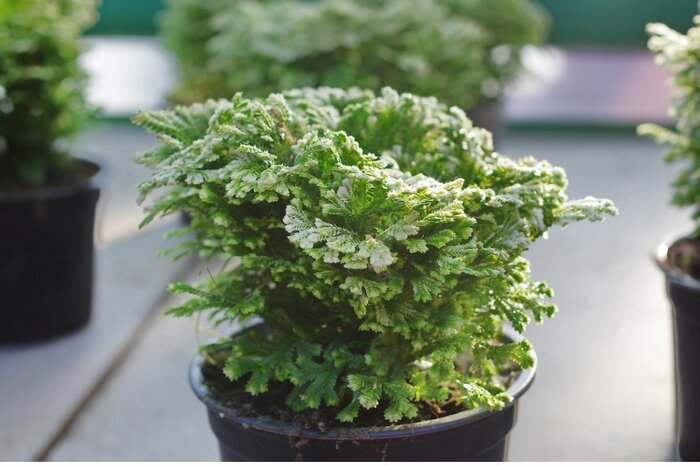 セネギネラはモフモフした感触がユニークなイワヒバ科の植物。丈夫で耐陰性があり、日陰でもよく育ちます。小枝を広げながらほふくし、花が咲いたように華やかな雰囲気。
