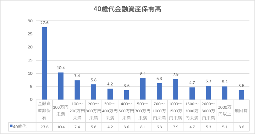 もっとも多いのは「金融資産非保有」(27.6%)です。そして、次に多いのは「100万円未満」(10.4%)です。まったく貯蓄がないというのが金融資産非保有となり、40歳代の場合、約4人に1人の割合となっているのがわかります。