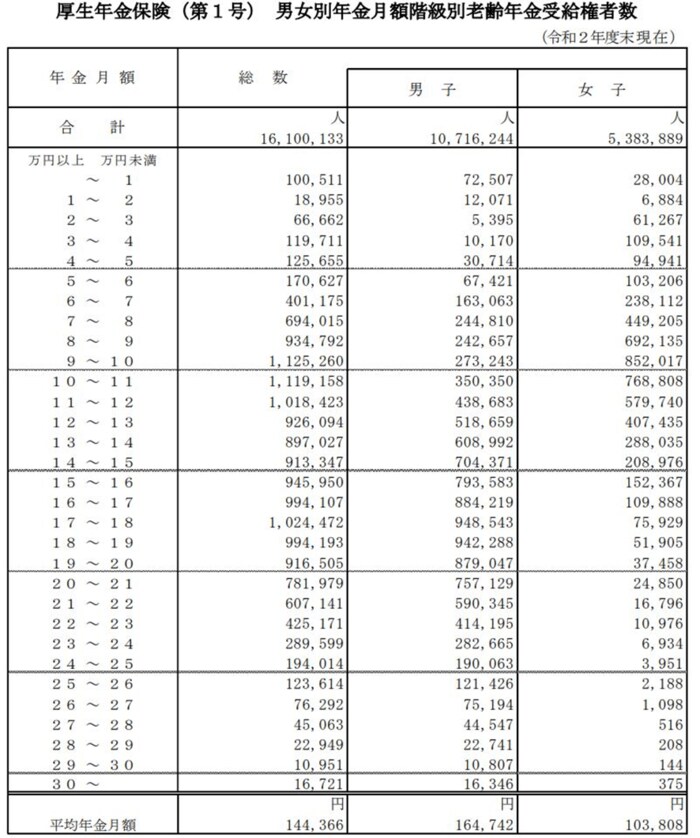 厚生年金の受給額は、現役時代の賃金や加入期間によって決まります。平均は14万4366円ですが、男性16万4742円、女性10万3808円、約6万円の差がありますね。