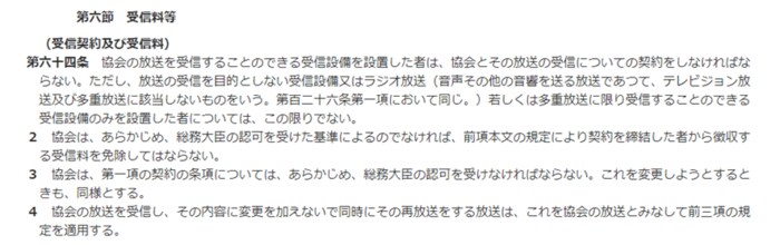 実は、放送法第64条に「NHKの放送を受信することができるテレビをお持ちの場合、NHKと受信契約をしなければならない」との規定があり、放送法に基づき総務大臣の許可を得て定められた日本放送協会放送受信規約で「放送受信料を支払わなければならない」と義務づけられているのです。
