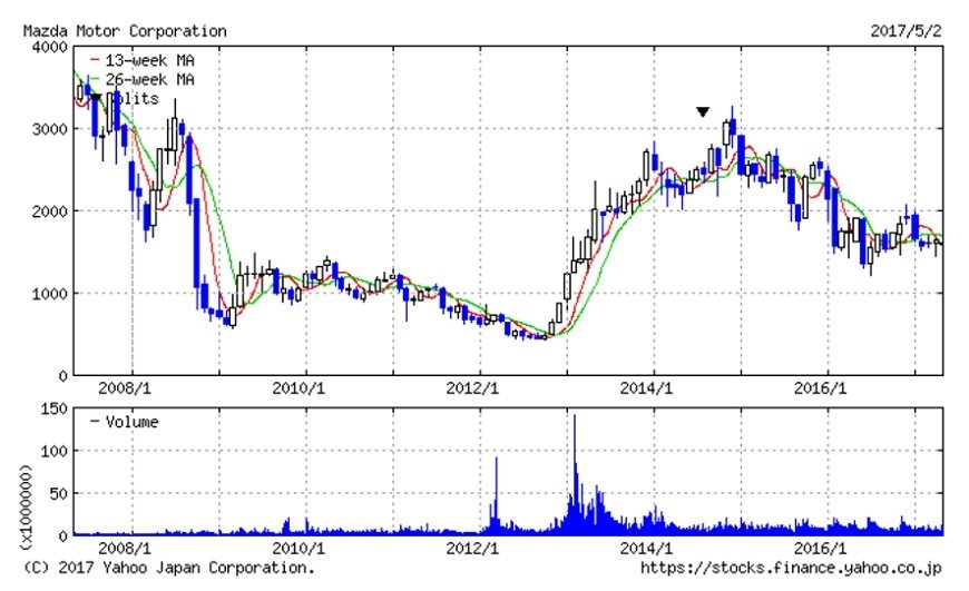 事業でのトランプリスクとは対照的に、トランプ相場の恩恵を若干受けたマツダ株は2016年12月16日に戻り高値2,066円を付けます。しかし、その後は一転して下落。結局2016年7月以降に位置していた1,500円付近の位置まで下がり、現在に至っています。
