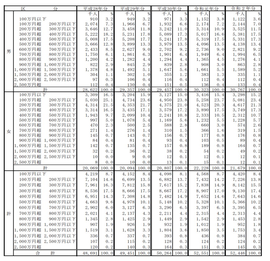 女性は年収100~200万円が最多で508万人(23.4%)となっており、男女間の給与水準には大きな差があることが分かります。