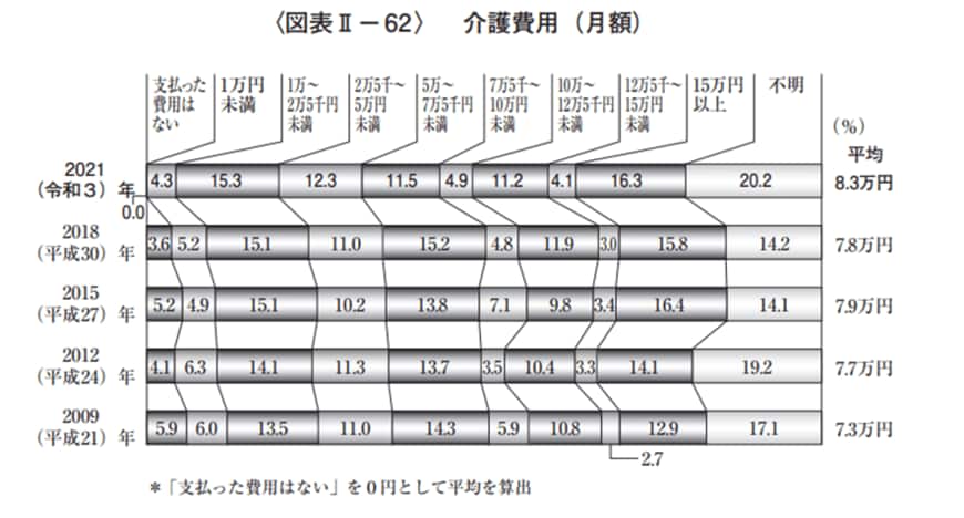 生命保険文化センター「 2021(令和3)年度 生命保険に関する全国実態調査」によると、月々の介護費用の平均額は8万3000円となっています。