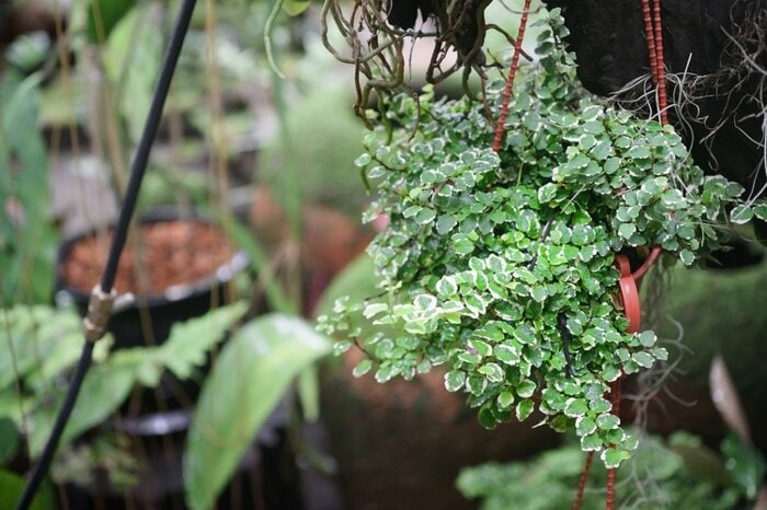 丸く小さな緑色の葉に、白の縁取りが涼しげなプミラ。旺盛に茎を伸ばしながらしだれるように広がります。土の表面が乾いたらたっぷり水を与えましょう。※参考価格:300~500円前後(3号ポット苗)