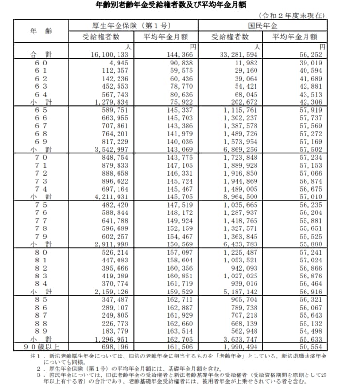 厚生労働省が公表した「令和2年度 厚生年金保険・国民年金事業の概況」によると、70歳代の年金受給額は以下のようになっています。