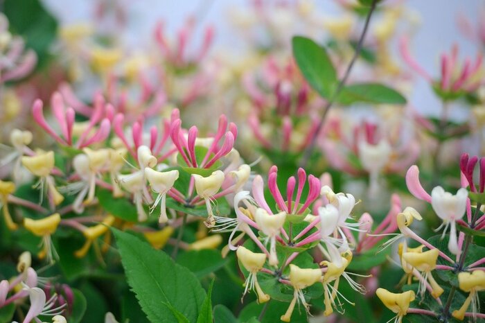 独特の形をした小花が集まって咲く様子が華やかなハニーサックル。濃厚な甘い香りを放ちミツバチを誘います。ツル性植物なのでフェンスなどにはわせると華やかに。