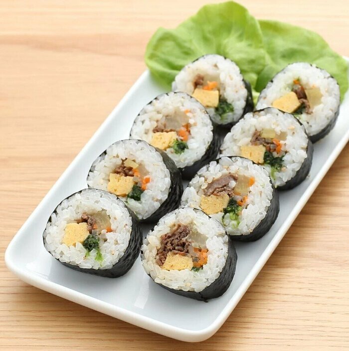 画像のように、牛肉や根菜を使ったキンパで、化学調味料を使わず、素材本来の色や味わいを生かしている点に特徴があります。