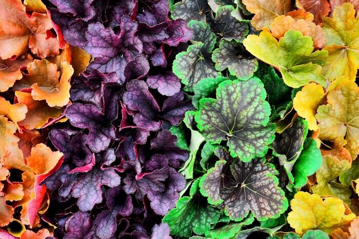 植えると庭がたちまちオシャレになるヒューケラ。赤、紫、黒、黄、ブロンズ、ライム、シルバー、斑入りなど色合いもオシャレです。参考価格:400~500円(3号ポット苗)
