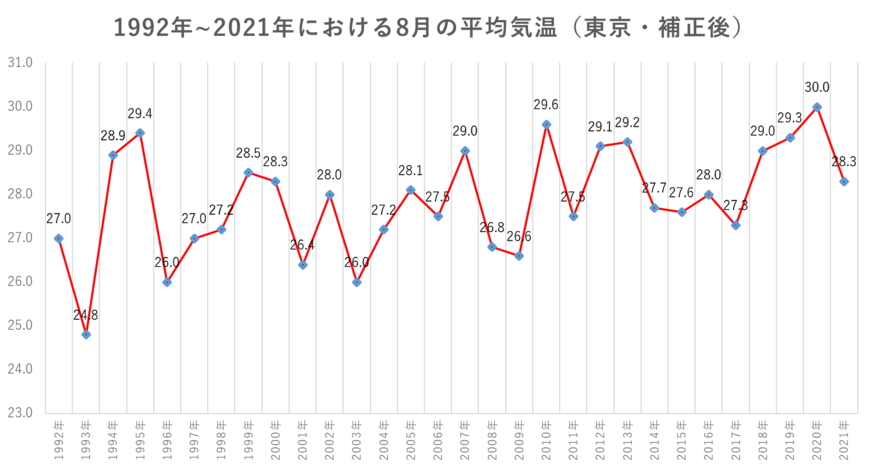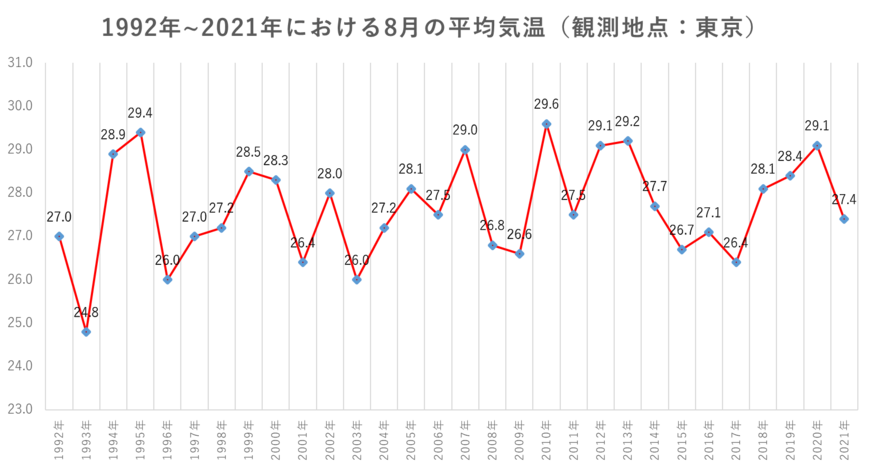 気象庁の計測によると、直近30年分における8月の平均気温は以下のように推移しています。