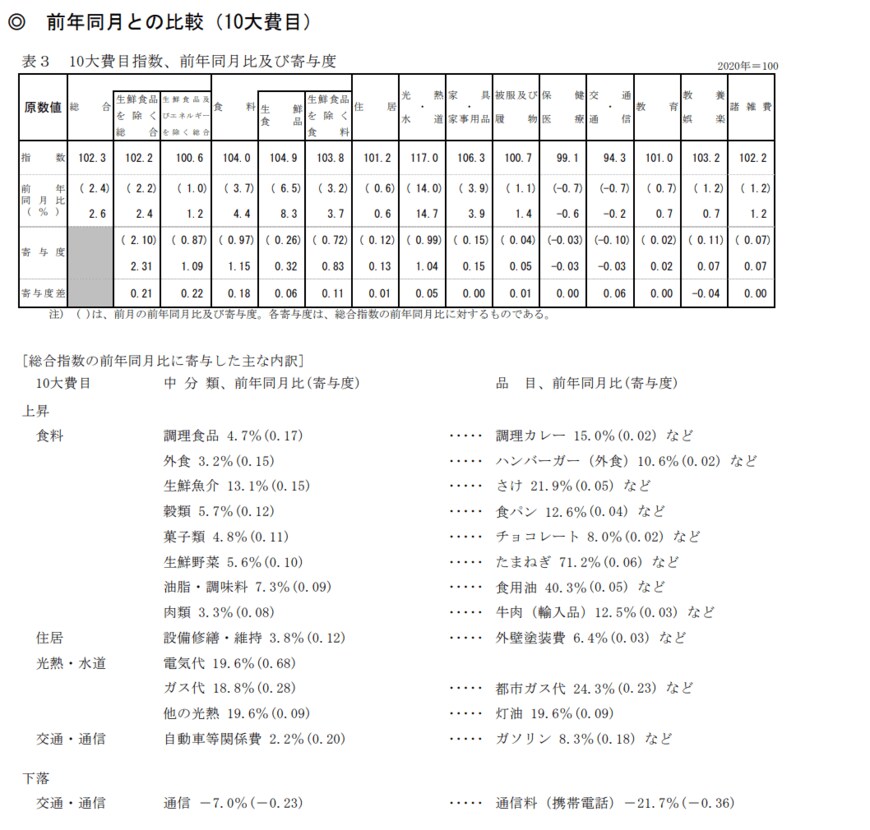 前年同月比で4カ月連続2%を超えており、特に都市ガス代24.3%、電気代19.6%、食用油40.3%などの上昇が目立ちます。