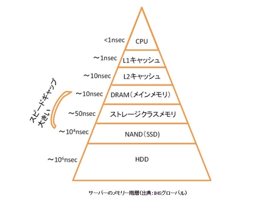 サーバーなどコンピューターのメモリー階層は、最上層にCPU(レジスター)、キャッシュメモリー(L1/L2)、その下にDRAM、SCM、SSD(NAND)、HDD、磁気テープに分かれている(図)。メモリーの処理スピードはCPU内部に内蔵されているレジスターが一番早く、その次にSRAMなどのキャッシュと続く。その代わり、上位層のメモリー容量は小さい。HDDなどの下の階層に行けば行くほどスピードが遅くなるが、安価で大容量化が可能な記憶媒体として普及している。
